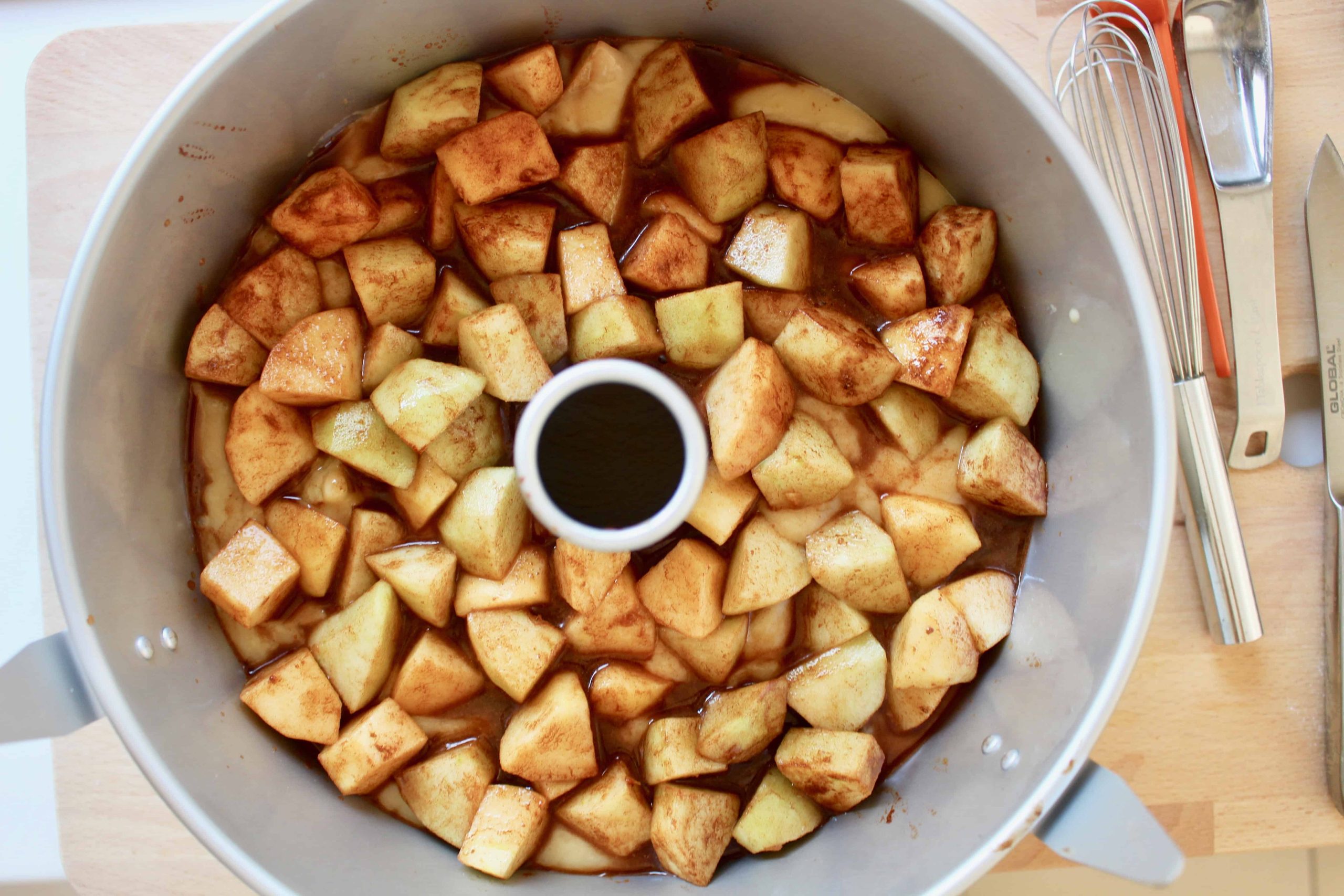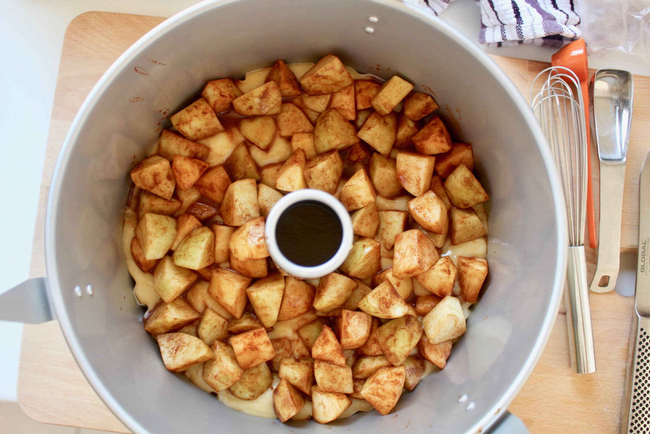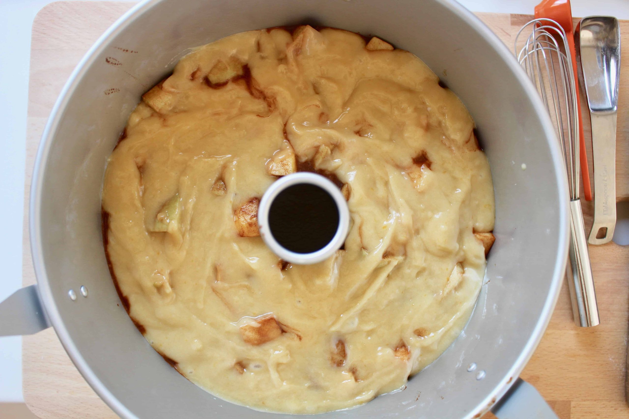 Pour half of the batter into the prepared tube pan. Spread half of the apples (plus their juices) evenly on top. Pour the remaining batter over the apples (it will barely cover them), and smooth it out evenly, then arrange the rest of the apples on top.