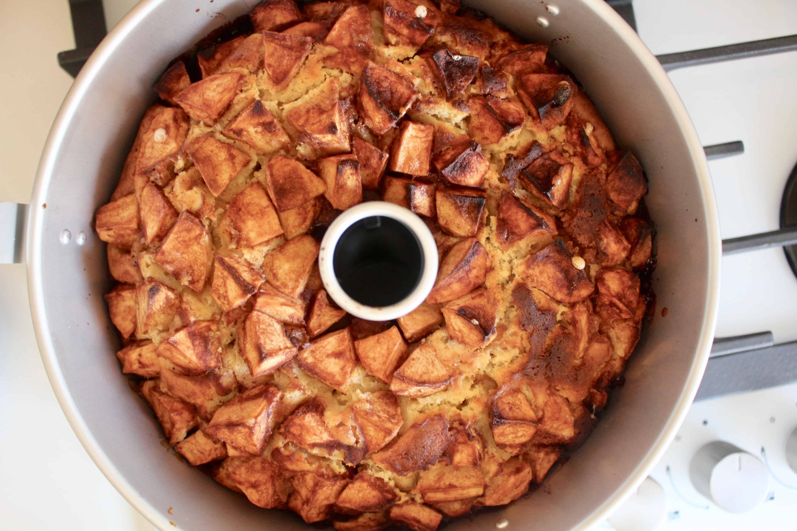 Cool the cake completely in the pan set over a wire rack. Run a small knife between the cake and the pan to loosen it, then invert it onto a platter and behold your apple-y glory.
