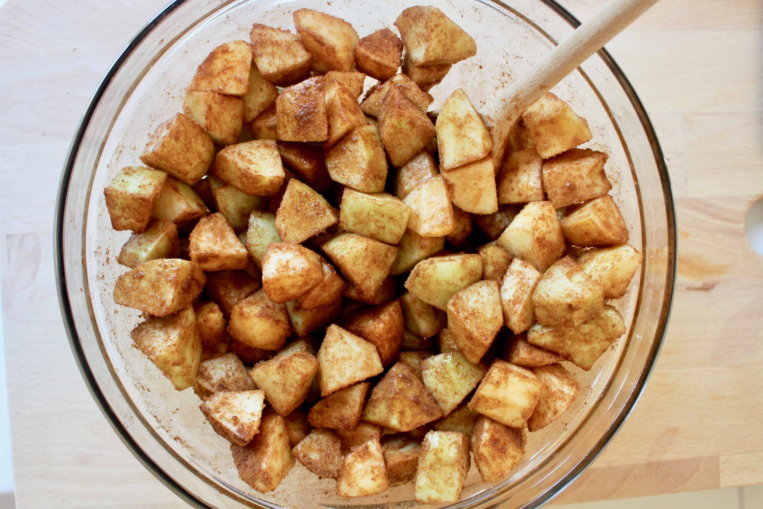 Place the apples in a medium bowl. Add the cinnamon and sugar, and toss together until the apples are evenly coated; set aside.