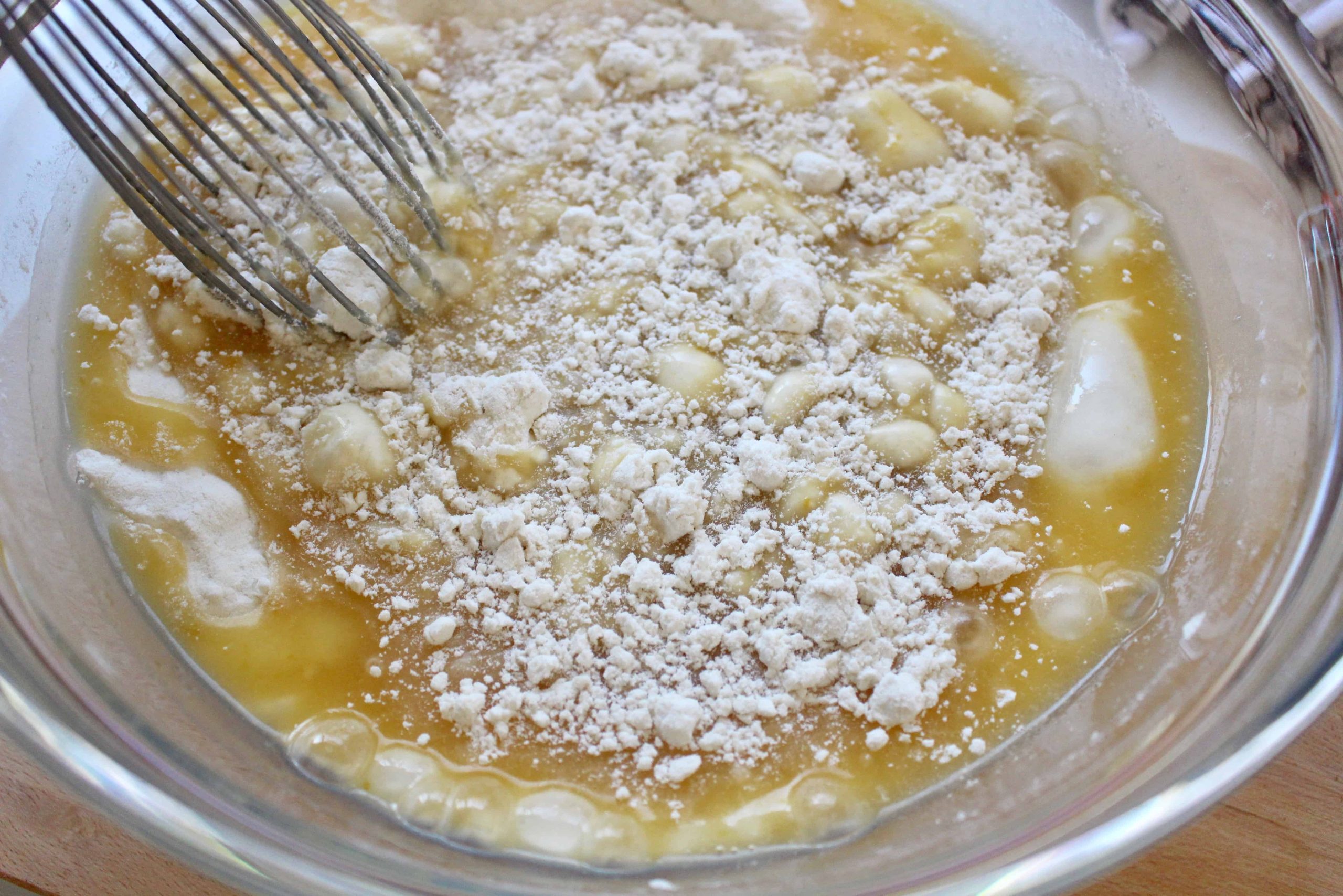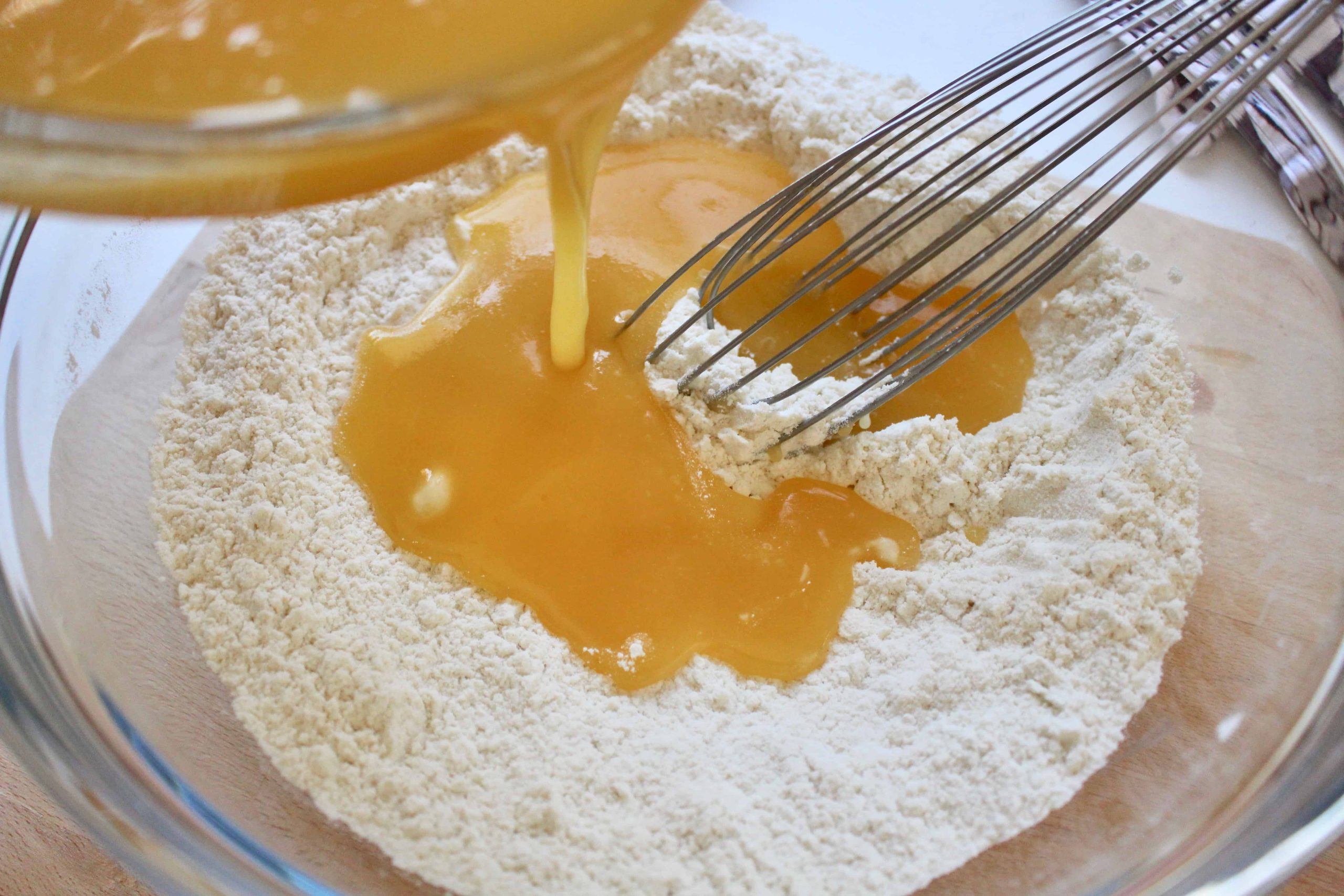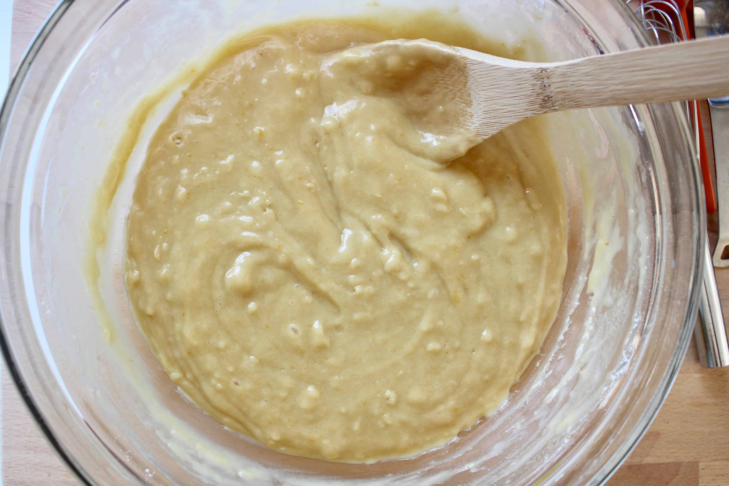 Whisk the flour, baking powder, and salt together in a large mixing bowl. In a different bowl, whisk the oil, orange juice, sugar, vanilla, and eggs until they are smooth and homogenous. Pour the wet ingredients into the flour mixture and mix together just until combined. (I switched to a wooden spoon for this step.) Scrape down the bowl to ensure that all the ingredients are evenly blended.