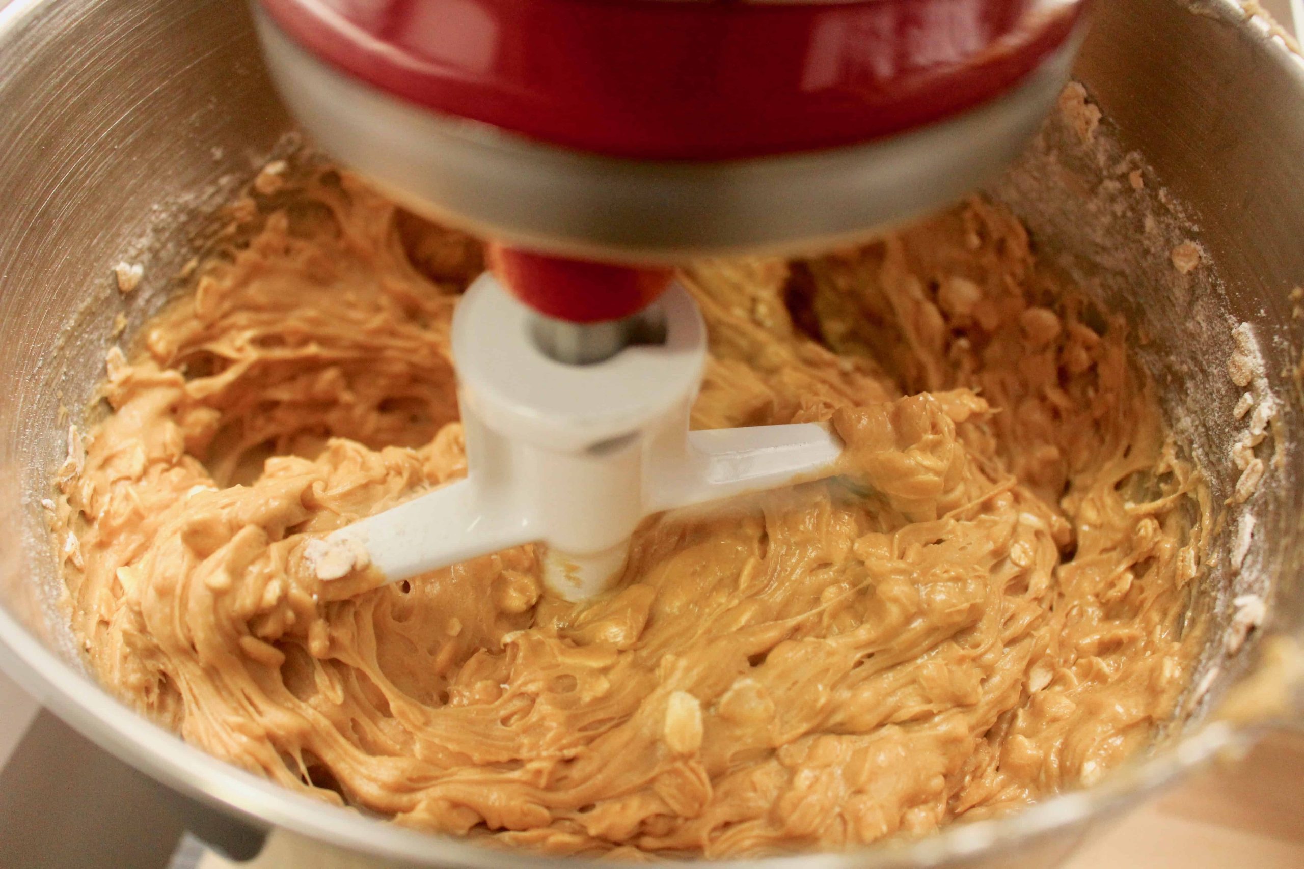 Anyway, these are very easy to pull together, as are most chocolate chip, oatmeal, and peanut butter cookies. The dough follows the typical creaming method of combining the butter with brown and white sugars, though you only beat them together until they’re just combined. This step took a good few minutes because there’s a high ratio of sugar to butter, so it needed some time to blend into the butter. You’ll then add the eggs, followed by vanilla and corn syrup.